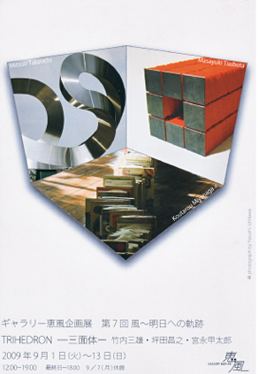 【場所】ギャラリー恵風 【日時】2009年9月1日(火)~13日(日) PM0:00~PM19:00 竹内三雄氏・宮永甲太郎氏とは初めての展覧会でしたが、お互いの作品を投げかけ合うという方法で、それぞれ数作品つくるという実 験的な試みを行いました。
